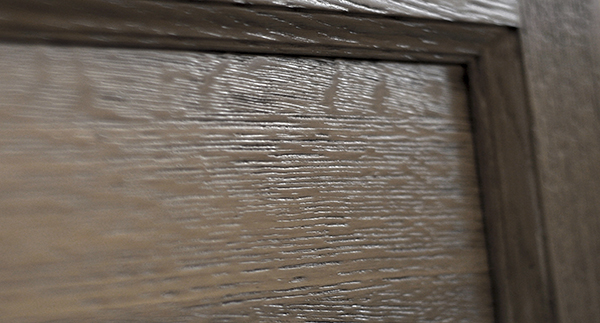Quarter sawn white oak wood with sandblasting which produces a weathered finish with catalyzed conversion varnish topcoat